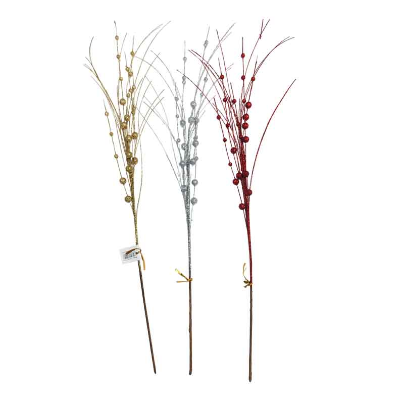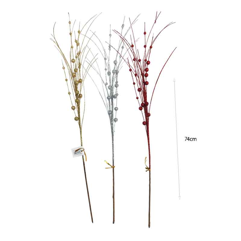 Λαμπερό χριστουγεννιάτικο κλαδί με γκλίτερ και διακοσμητικές μπάλες, ύψους 74cm. Διατίθεται σε χρυσό, ασημί και κόκκινο χρώμα. Ιδανικό για στολισμό δέντρου, βάζου ή γιορτινών συνθέσεων.