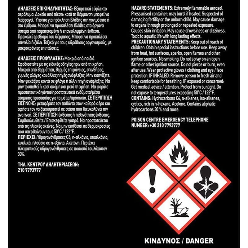 Σημείωση: Μην ψεκάσετε σε ζεστές / πυρωμένες επιφάνειες. Πριν τη χρήση σε πλαστικά και ελαστικά μέρη, δοκιμάστε το καθαριστικό σε επιφάνεια που δεν είναι ορατή.