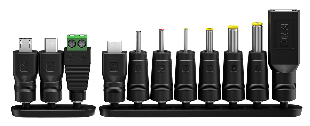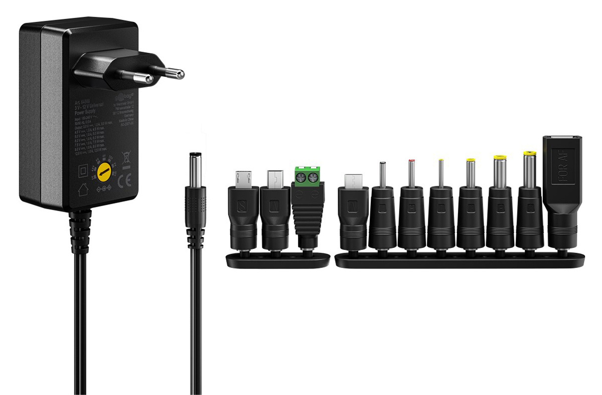 Universal φορτιστής της Goobay για την φόρτιση και τροφοδοσία ηλεκτρικών συσκευών. Διαθέτει 7 διαφορετικά βύσματα τροφοδοσίας και αντάπτορες USB, USB-C, micro USB, USB mini και screw terminal connection.