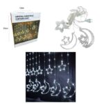 Κουρτίνα φωτισμού μήκους 3 μέτρων με Ψυχρό φωτισμό και 10 LED σε σχέδιο αστεριών και φεγγαριών. Δημιουργεί μια μαγική και εορταστική ατμόσφαιρα για τα Χριστούγεννα, ιδανική για παράθυρα, τοίχους ή βιτρίνες. Εύκολη στην τοποθέτηση και οικονομική στην κατανάλωση ρεύματος.