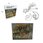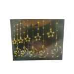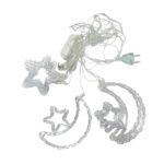 Κουρτίνα φωτισμού μήκους 3 μέτρων με θερμό φωτισμό και 10 LED σε σχέδιο αστεριών και φεγγαριών. Δημιουργεί μια μαγική και εορταστική ατμόσφαιρα για τα Χριστούγεννα, ιδανική για παράθυρα, τοίχους ή βιτρίνες. Εύκολη στην τοποθέτηση και οικονομική στην κατανάλωση ρεύματος.
